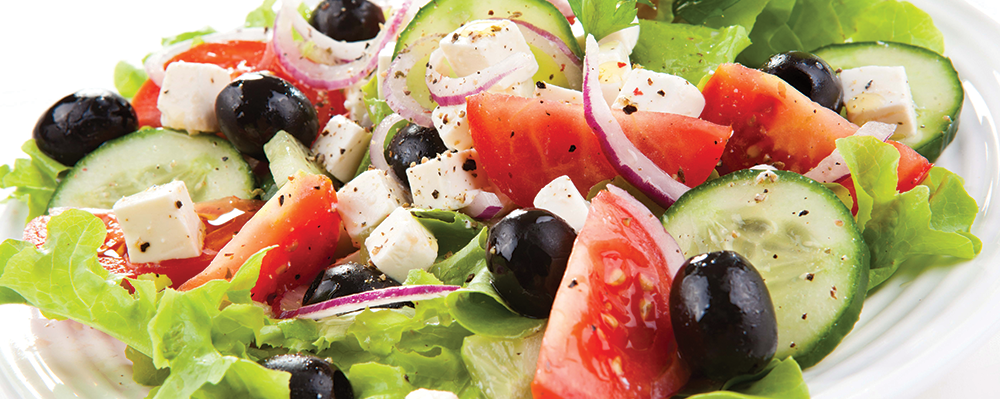 Fresh Field Greens, Tomatoes, Cucumbers, Onions, Feta Cheese, Mediterranean Olives & Pepperoncini